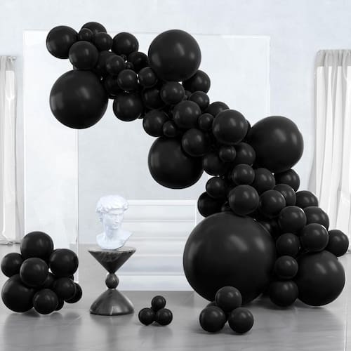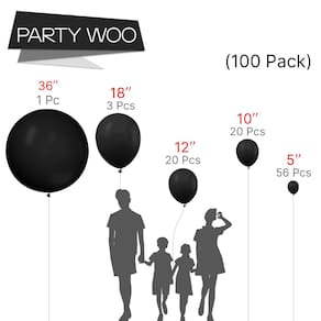 - 100 unidades de balões pretos de tamanhos diferentes: o pacote inclui balão de 36 polegadas (1 unidade), balões de 18 polegadas (3 unidades), balões de 12 polegadas (20 unidades), balões de 10 polegadas (20 unidades), balões de 5 polegadas (56 unidades)