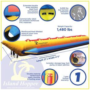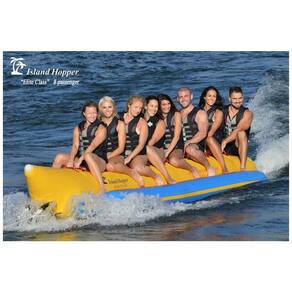 Barco de banana de nível projetado para acomodar 8 amigos em qualquer condição de água. Material Resistente a UV reforçado 1100 denier. Material denso resistente a perfurações, reforçado em áreas de alta tensão. Qualidade costuras soldadas e nariz vem para resistência e vida útil prolongada. Anéis de tração de aço inoxidável, arnês de reboque com alavanca de aço Dimensões infladas 6 metros Comprimento x 1,2 m. Carga máxima 8 pilotos 765 kg Marca: Não Informado
