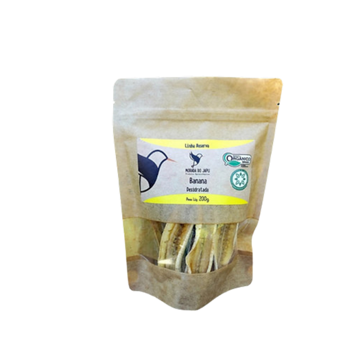 A Banana Desidratada Orgânica Morada do Japu é feita com bananas maduras fatiadas, cultivadas em sistema agroflorestal com práticas da Biodinâmica em meio à Mata Atlântica no Sul da Bahia.