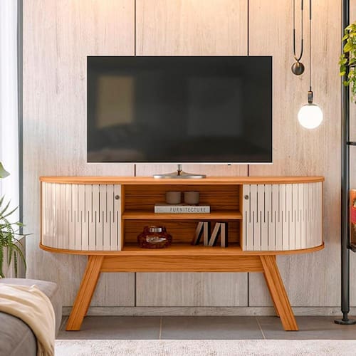 Características: Estrutura em MDP Pintura com acabamento UV 02 Portas flexíveis em MDF Puxadores Poliestireno Cromado Pés Palito Tampo e Base com Detalhes Curvos Suporta TVs de até 55"