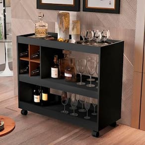 Além de ser produzido em MDP, o Aparador possui 4 Rodízios para melhor movimentação e 4 Espaços para Garrafas e Copos.