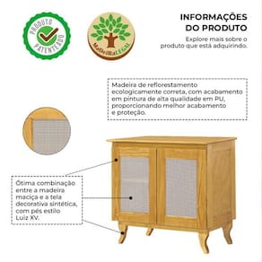 Fabricado em madeira maciça de reflorestamento, ecologicamente correta, o aparador traz também uma tela decorativa sintética que adiciona textura e leveza ao visual. Os pés no estilo Luiz XV reforçam o charme clássico, enquanto o acabamento em pintura PU de alta qualidade garante proteção, durabilidade e um acabamento refinado. Uma escolha inteligente para quem não abre mão de beleza, resistência e responsabilidade ambiental.