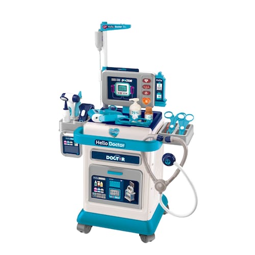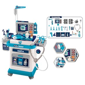 Equipado com 37 acessórios de médico realistas, este brinquedo é um verdadeiro centro de atividades que convida os pequenos a mergulhar em um mundo de descobertas. Entre os destaques, está o termômetro, que emite som dando um toque ainda mais real à brincadeira. Estetoscópio, tesouras, pinças, seringas, monitor, medidor de altura, película plástica de Raio-X, entre outros, não poderiam faltar nesta brincadeira.
