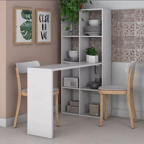 É o caso desta bancada. possui um design moderno e inovador, além de contar com 8 prateleiras grandes e mesinha para as refeições, uma ótima escolha para a funcionalidade que seu cliente precisa no dia-a-dia