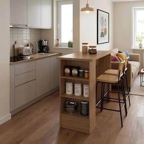 Combine essa bancada com banquetas altas para criar um espaço perfeito para café da manhã, refeições rápidas ou momentos especiais com amigos e família.
