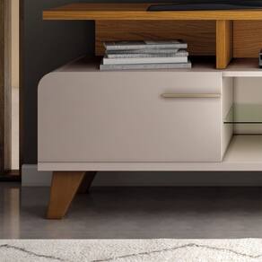Observações: Ideal para TV de até 60” apoiada sobre a base; Cantos arredondados; 02 portas basculantes com pistão a gás; Prateleira de vidro 6mm; Puxadores metálicos em tom dourado; Pés de madeira maciça com acabamento envernizado; Produzida em MDP e MDF de 25mn e 15mm;