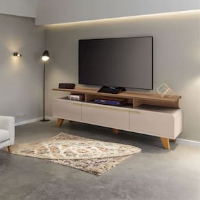 Observações: Moderna e sofisticada mesclada ao estilo orgânico com cantos arredondados; Ideal para TV de até 70” apoiada sobre a base; 03 Portas basculantes com pistão a gás; Puxadores metálicos em tom dourado; Pés de madeira maciça com acabamento envernizado; Produzida em MDP e MDF de 25mm e 15mm;