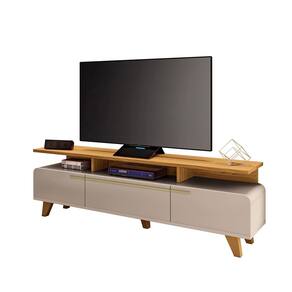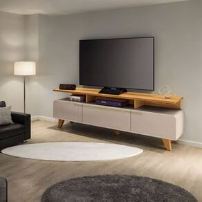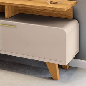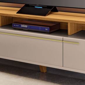 Observações: Moderna e sofisticada mesclada ao estilo orgânico com cantos arredondados; Ideal para TV de até 70” apoiada sobre a base; 03 Portas basculantes com pistão a gás; Puxadores metálicos em tom dourado; Pés de madeira maciça com acabamento envernizado; Produzida em MDP e MDF de 25mm e 15mm;