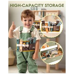 A Estação de Brincadeira Versátil da ROBUD apresenta uma resistente bancada em madeira, um cinto de ferramentas com bolsa de armazenamento e óculos de proteção, incentivando as crianças a aprimorar suas habilidades práticas e imaginação por meio do jogo de simulação de ferramentas. O cinto de ferramentas incluído possui um compartimento generoso para armazenamento, permitindo às crianças transportar e organizar ferramentas de forma conveniente, ideal para aventuras dentro e fora de casa. Cada componente do Conjunto de Ferramentas Infantil da ROBUD é cuidadosamente projetado com características de segurança, garantindo bordas lisas para as mãos pequenas. Além de um simples brinquedo, este conjunto oferece uma infinidade de modos de jogo interativos. Os pequenos podem liberar sua criatividade e alegria através da montagem e desmontagem de ferramentas, com cada elemento cuidadosamente projetado para promover aprendizado e desenvolvimento contínuos. Estimula a Coordenação Motora usar ferramentas em um ambiente supervisionado, ajuda a desenvolver habilidades motoras, capacidades de resolução de problemas e foco, à medida que as crianças brincam de fazer projetos.