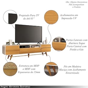 Material da Estrutura: MDP e MDF de 15mmPeso Suportado: 50 Kg distribuídosEspaço para TV: Até 85 PolegadasPortas: Sim, 3Pés: Madeira Maciça TorneadosPuxadores: Sistema Fecho Toque IntegradoDobradiças: Metálicas com Pistão a GásAcabamento: Impressão UV de Alta QualidadeAcompanha Manual de Montagem: SimConteúdo da Embalagem: 1 Bancada