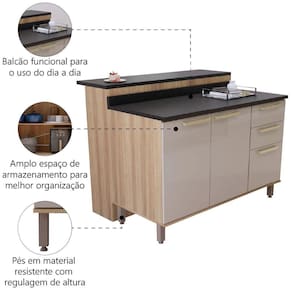 A Bancada Ilha com Balcão Isis é ideal para quem procura um produto prático, elegante e funcional. Pode ser sozinho ou como complemento da cozinha de modelo Isis, possui 3 portas que dispõem de amplo espaço para guardar o que precisar, e 2 gavetas com corrediças telescópicas permitindo um suave deslize -. O balcão junto de uma bancada mais elevada, a qual possui detalhe ripado autêntico em sua face interior, e o tampo, permitem que você tenha uma bancada versátil e espaçosa, com capacidade para colocar eletrodomésticos e decorações. O produto possui pés resistentes e reguláveis que não agridem o piso. Seu acabamento garante firmeza e resistência ao móvel, trazendo um design mais moderno para sua cozinha. Feito com materiais de qualidade trazendo resistência e durabilidade a vida útil do produto.