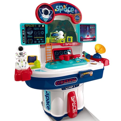 Recomendado para crianças a partir de 3 anos, este incrível kit vem em uma caixa com mais de 23 acessórios, incluindo suportes, placas, painéis de controle, astronautas e adesivos decorativos.