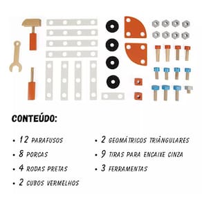 Peças Inclusas: 3 ferramentas, 12 parafusos, 8 porcas, 4 rodas, 2 cubos vermelhos, 2 triângulos vermelhos, 9 tiras de encaixe cinza e muito mais!