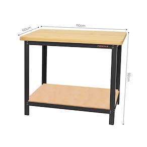 Tampo superior em pinus maciço de 40 mm e inferior em MDP de 15 mm de espessura. É possível personalizar a bancada, adquirindo o Tampo em aço galvanizado 1,10 m (código 91514) e/ ou 1 gaveta (código 91509), ambos são acessórios e não acompanham este produto.