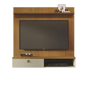 Porta basculante com dobradiças metálicas, painel lateral em MDF frisado (baixo relevo), puxador com acabamento dourado fosco e revestimento que simula couro natural, prateleira superior com borda chanfrada, painéis em MDP de 12, 15 e 25mm. Produto desenvolvido para ser fixado na parede. O televisor deve ser fixado no painel.