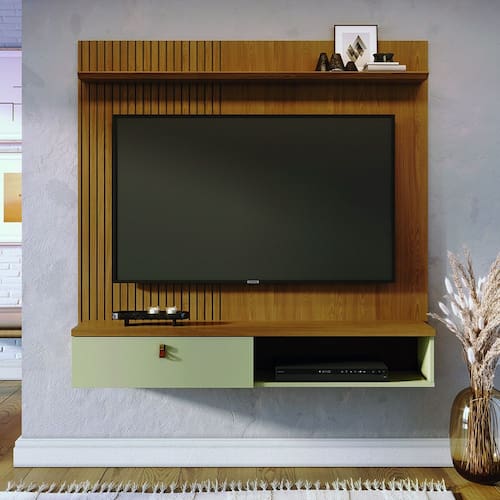 Características: Estrutura em MDP Pintura semi brilho Porta Basculante Dobradiças Metálicas Puxador com acabamento dourado fosco e revestimento que simula couro Prateleira superior com borda chanfrada Painel lateral frisado Espaço para TV até 55 Polegadas.
