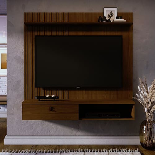 Produto desenvolvido para ser fi xado na parede. O televisor deve ser fi xado no painel. Porta basculante com dobradiças metálicas, painel lateral em MDF frisado (baixo relevo), puxador com acabamento dourado fosco e revestimento que simula couro natural, prateleira superior com borda chanfrada, painéis em MDP e MDF de 1,2, 1,5 e 2,5. Produto Montado: Sim Acabamento da Porta: Pintura UV Acabamento da Prateleira: Pintura Texturizada UV Ambiente Principal: Sala de Estar codigo_ean: 7900288050793 Complexidade da Montagem: Média: pode ser montado por mais de uma pessoa e/ou necessite de maior conhecimento para montagem Cor: Cumaru Cor do Produto: Cumaru Escala de Brilho: Semi-Brilho Escala de Brilho da Porta: Semi-Brilho Escala de Brilho da Prateleira: Não Possui Ideal para TVs até (Polegadas): 55 Itens Inclusos: 1 bancada Manual de Montagem e Instalação: https://product-hub-prd.madeiramadeira.com.br/975619/documents/d65aad22-e0d5-4a57-b676-77ec86a64cf8264842882617377452896334.pdf Marca: Madetec Material da Porta: MDP Material da Prateleira: MDP Material Principal: MDF/MDP Necessita Montagem: Sim Origem do Produto: Nacional Peso: 36,8 kg Peso Máximo por Prateleira: 3 kg Possui Espelho: Não Possui iluminação: Não Possui Nichos: Não Possui Pés: Suspenso Recomendações de Uso, Manutenção e Limpeza: "Para a limpeza utilizar um pano limpo e seco. Não limpar com produtos abrasivos ou escovas; Não deixar exposta à luz do sol diretamente pois isso irá diminuir a vida útil do produto; Este produto Não é recomendado Para ambientes externos onde possa receber chuva." Sistema de Montagem: Girofix Suporta Até (kg): 36 kg Tipo de Puxador da Porta: Embutido