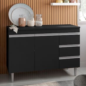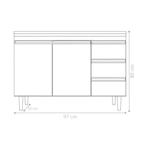 Possui 3 portas e 1 prateleira interna, 3 gavetas