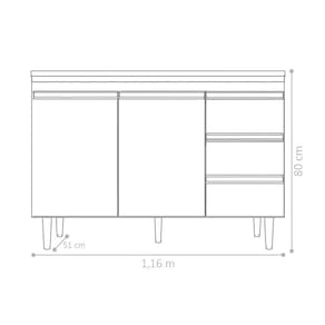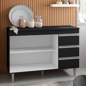 Possui 3 portas e 1 prateleira interna, 3 gavetas