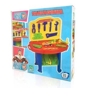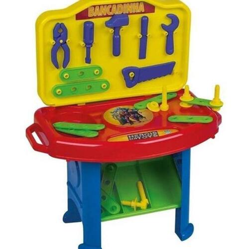 Uma super bancada de ferramentas para brincar Uma bancada com ferramentas dos Heróis da Toys para brincar de montar e desmontar usando o martelo, alicate, chave de boca, chave de fenda, serrote, lima, placas com furos, parafusos e porcas. Os meninos vão se divertir muito com a Bancadinha de Ferramentas Herois da Super Toys.