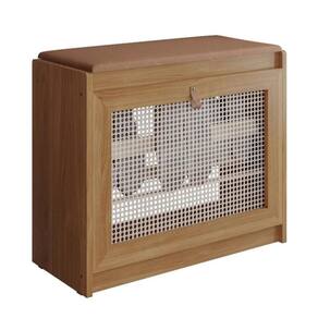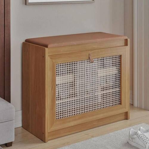 Frente em Tela de Rattan Sintético: A tela de rattan sintético na frente da sapateira confere um visual rústico e contemporâneo, agregando charme e modernidade ao design do banco.