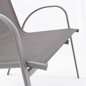 O banco para duas pessoas da Alma combina perfeitamente com a mesa baixa e as poltronas cinza escuro. Produto confeccionado em textilene acolchoado que oferece excelente conforto, resiste a elementos climáticos que podem ser limpos facilmente.