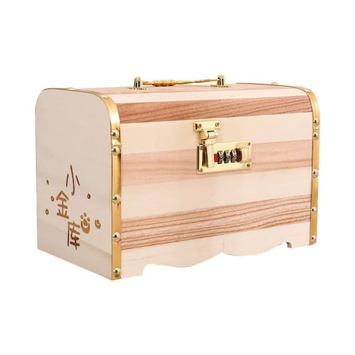 Tamanho: 25X15X16.5cm Material: Madeira1. Sistema de depósito unidirecional: projetada para aceitar apenas dinheiro, esta caixa ajuda a incentivar hábitos de poupança consistentes, evitando saques não autorizados. 2. Mecanismo de travamento premium: equipado com uma trava combinada resistente para maior segurança, ideal para adultos, adolescentes ou crianças mais velhas que estão aprendendo disciplina financeira. 3. Design elegante de madeira de dois tons: apresenta painéis alternados de grãos de madeira natural com detalhes em metal dourado para uma aparência refinada e elegante, adequada para exibição. 4. Capacidade generosa: o interior espaçoso (25x15x16,5 cm) permite o armazenamento de moedas, dinheiro e notas, perfeito para rastrear metas de longo prazo ou salvar desafios. 5. Durável e resistente a quedas: construído em madeira maciça com bordas reforçadas e acabamento liso, projetado para suportar o manuseio diário e proporcionar um uso duradouro.