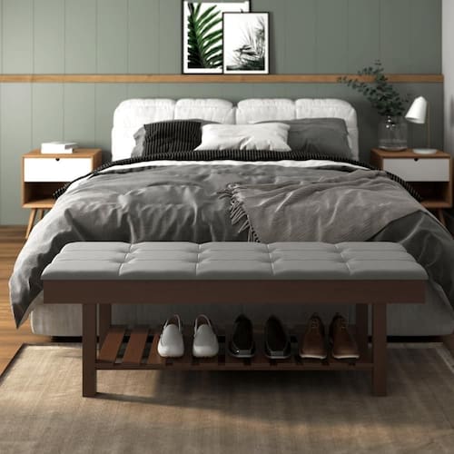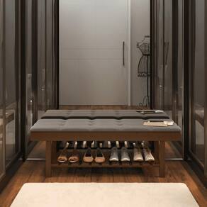 O Banco Em Madeira Almofadado Com Sapateira é perfeito para quem busca um banco funcional com espaço para guardar sapatos. O almofadado oferece conforto extra para usar como apoio.