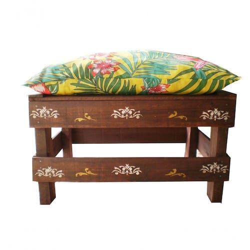 Lindo banquinho, feito de madeira maciça de reflorestamento ou reaproveitada (pallet), com acabamento envelhecido em tom canela e decorado artesanalmente.Reforçado, é entregue montado!!Acompanha Almofada floral Decoração Sustentável: Ajude a preservar a Natureza!!!