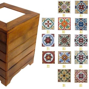 Possui no tampo, um ladrilho hidráulico feito artesanalmente em cimento com pintura solida queimada possui desenhos e cores encantadoras. diferentemente do Azulejo, o Ladrilho Hidráulico é Artesanal, o que faz com que cada peça seja única em seus detalhes, além de possuir aspecto poroso e maior resistência que o Azulejo.