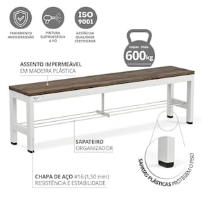 Com acabamento de excelência, é o banco ideal para academias, clubes e vestiários corporativos, este banco combina resistência e funcionalidade. Sua estrutura em aço perfil tubo 50x30 oferece durabilidade, enquanto o assento em madeira plástica impermeável garante higiene e fácil manutenção. A sapateira integrada otimiza o espaço, e as sapatas em polipropileno protegem o piso.