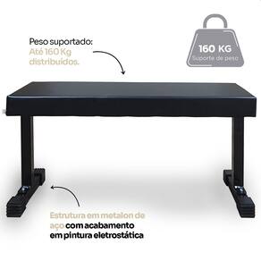 Características Principais: • Modelo: Banco Reto para Musculação • Material: Estrutura de aço com pintura eletrostática • Estofado: MDF 18MM. Espuma de densidade D33, revestido com tecido Servile • Base: pés com acabamento em PVC • Dimensões: o Altura Total: 44 cm o Altura do Estofado: 7 cm o Largura: 32 cm o Comprimento: 92,5 cm o Espaço entre os pés: 80 cm • Peso Máximo Suportado: 160 kg • Compacto, leve e resistente: Ideal para treinos em casa e academias