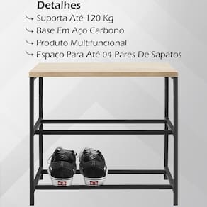 Banco Sapateira Industrial Em Aço F84 Pinus, ideal para qualquer ambiente, excelente solução para decorar e otimizar pequenos espaços, com design moderno e funcional. Estrutura em madeira Pinus e Aço Carbono, com pintura em acabamento Epóxi (Fosco). Composta por tampo em Madeira Pinus, e estrutura em Aço Carbono com espaço disponível para até 04 pares de sapatos, é um produto multifuncional serve também de banco para sentar. Suporta até 120 Kg. Seu quarto, sacada, hall de entrada vai ficar muito mais organizado com esta sapateira estilo industrial. Este móvel chegará na sua casa separado em 01 volume.