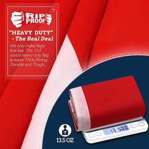 A bandeira com tecnologia Anley Rip-Proof pesa 13,5 onças, com escurecimento total, sem transparência e, portanto, com uma cor mais viva e brilhante.