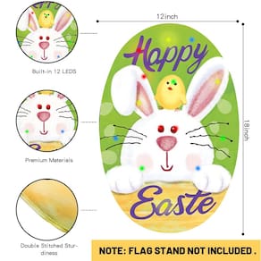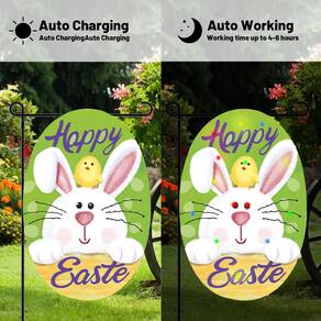Feito de material premium. O tecido grosso e os pontos duplos o tornam durável de usar. O padrão personalizado é o mesmo em ambos os lados. O tecido à prova de intempéries e resistente ao desbotamento não desfia após o uso contínuo. Possui manga na parte superior que se encaixa em mastros ou suportes padrão. O suporte de bandeira não está incluído. - Bandeira de jardim de Páscoa LED solar: esta bandeira de jardim de coelho da Páscoa está equipada com 12 luzes e painel solar. A luz acende automaticamente ao anoitecer e desliga para carregar durante o dia, desde que o painel solar esteja exposto à luz solar (Observação: o mastro não incluído) - 8 modos de iluminação: você pode escolher entre 8 modos de iluminação diferentes para melhorar o ambiente festivo, tornando seu quintal colorido durante o festival de Páscoa - Tecido premium: Feita de poliéster resistente às intempéries, esta bandeira de jardim de coelho da Páscoa com luzes apresenta um design de 2 camadas, dupla face com imagem de padrão visível de ambos os lados. Comporta bem em qualquer clima e ainda mantém colorida e durável - Ideal para decoração e presente de primavera de Páscoa: uma decoração maravilhosa para o seu jardim, varanda ou pátio. É um presente de Dia de Páscoa atencioso para amigos, familiares ou vizinhos que amam decoração sazonal - Fácil instalação: a bandeira de jardim iluminada ao ar livre mede 30,5 x 45,7 cm e se encaixa na maioria dos mastros de bandeira de jardim padrão, simplificando a instalação em seu quintal, jardim ou varanda da frente com o mínimo de esforço