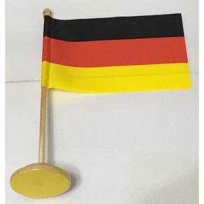 Bandeira de mesa da Alemanha dimensões: altura do mastro: 30 cm bandeira: 19 cm de comprimento x 14 cm de largura mastro: madeira de reflorestamento bandeira feita em poliéster Impressa frente e verso Marca: Mundo Das Bandeiras