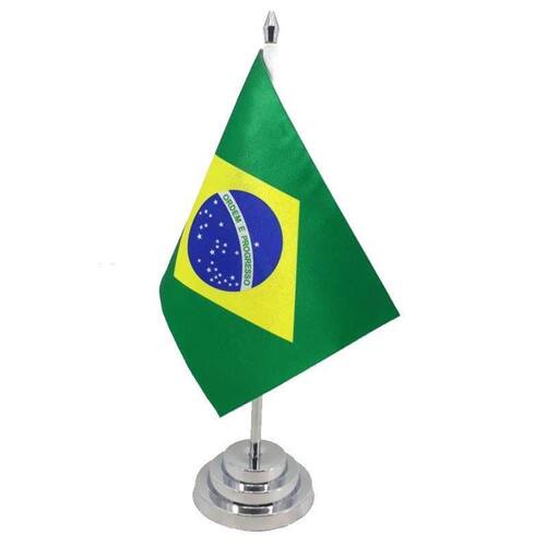 Produzida em tecido poliéster de alto brilho Mini bandeira de mesa com haste Haste medindo 29 cm Base medindo 3,5 cm Bandeira medindo 20 cm x 14 cm Base e mastro em pvc cromado Estampa nas duas faces da bandeira