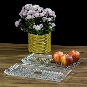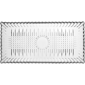 Essa linda bandeja é fabricada em vidro transparente e se destaca pelas lapidações em sua base e nas bordas.