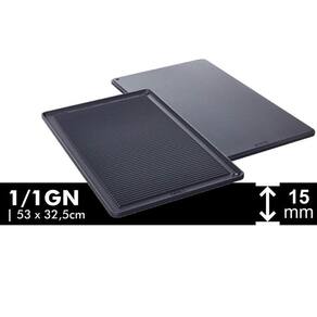 Ideal para: Grelhados e pizzas Material: Aço Carbono com revestimento antiaderente (trilax) Tabuleiro para Grelha e Pizza 1/1 Dimensões (LxPxA): 53 x 32,5 x 1,5cm Dimensões Gastro Norm (GN): 1/1GN x 15mm