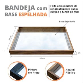 Descrição Se você procura uma solução para servir café a seus amigos, clientes ou simplesmente levar frutas para sua mesa de café as bandejas espelhadas da clip são a melhor maneira de fazer isso. Resistentes, lindos, desenvolvidos com madeira de pinos de reflorestamento, possuem um espelho que da uma aparência de luxo ao seu ambiente. Temos nas cores rústicas ou preto. Simplesmente sensacional para impressionar qualquer um no seu redor. Perfeito para aqueles que necessitam de uma bandeja espelhada elegante servindo ou transportando objetos. Destaca-se por seu design rústico e por sua funcionalidade Beneficio ao dia a dia, tanto em seu ambiente de trabalho ou em casa. Grandes aliados para reinventar a decoração, as bandejas espelhadas são uma opção prática para dar sua própria identidade ao seu ambiente. Cores disponíveis Preto-noire, rústico Especificações: Madeira de reflorestamento livre de imperfeições com acabamento pintado. Qualidade premium feito com maquinário de última geração Medidas aproximadas: 3 x 30 x 45 profundidade x altura x largura . : 3 mêses contra defeitos de fabricação. Despacho em 24 horas Enviamos para todo brasil Direto da fabrica 25 anos de experiência Embalagen segura Qualidade comprovada de troca Tem alguma dúvdia. Faça-nos uma pergunta Limpeza e cuidados: limpar estrutura com pano levemente umedecido com água, seguido de pano seco. Cuidados: não utilizar produtos químicos ou abrasivos na limpeza. Evitar batidas. Para isso basta navegar por nossos anúncios em mais anúncios do vendedor ou em ver todos os anncios e adicionar ao carrinho os produtos desejados um de cada vez. História clip O suíço, alexander buholzer decidiu quando mais jovem, vir a america do sul. O clima e a ção dos brasileiros fizeram com que o brasil se destacasse entre os outros países, e , portanto em 1994, escolheu ficar e montar sua empresa nesta linda terra tropical. Alex desde pequeno tinha um grande interesse em guardar todos os retratos da sua família, principalmente, porquê sem estas fotos não existiriam histórias . Assim nasceu a empresa clip juntos com ela todos os seus álbuns, porta retratos e produtos para guardar suas melhores lembranças de vida................ Marca: Não Informado Ean: 7793561797290