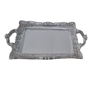 A bandeja com espelho e acabamento em flor de prata é uma peça decorativa que mescla funcionalidade com um toque de glamour.A borda é enfeitada com um delicado design em formato de flores, criando uma estética encantadora e atraente.O fundo espelhado reflete a luz e os itens dispostos sobre ele, criando uma sensação de amplitude e luminosidade. Isso também destaca os objetos posicionados na bandeja, tornando-a perfeita para exibir itens decorativos. Ideal para mesas de centro, cômodas ou pias de banheiro como um organizador elegante.