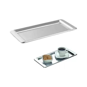 Por que esta Bandeja Inox é Indispensável Design Sofisticado: Com seu formato retangular clássico e acabamento em prata inox, esta bandeja eleva a apresentação de qualquer prato ou item servido, impressionando seus convidados.