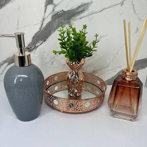 Kit decoração bandeja redonda de metal com fundo espelhado, difusor de vidro na cor marrom, porta sabonete líquido de cerâmica estampa granilite e vaso rose gold de cerâmica trabalhado.