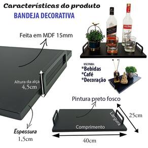 Bandeja Decorativa De Madeira Cantinho do Café Doces Bebidas Bandeja Decorativa Prática para você ter na sua casa. Além de decorar muito bem, pode ser Utilizado em ambientes como quarto, sala, em um belo café da manhã ou servir aqueles drinks para seus amigos. Feita em MDF 15mm com acabamento em pintura preto fosco. Material de ótima qualidade. Medidas: Largura 25cm X Comprimento 40cm x Espessura 1,5cm e Altura de 4,5cm Acessórios não acompanham o produto Feito em Material de ótima qualidade