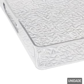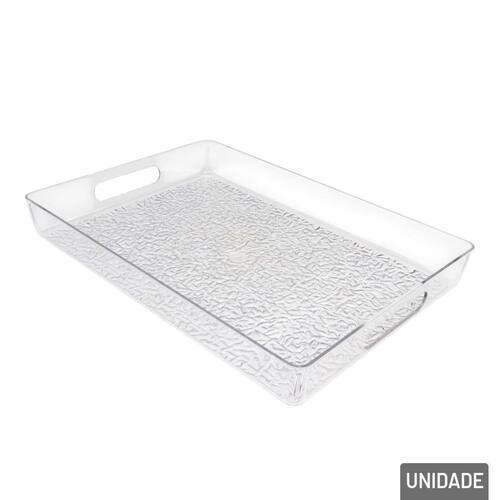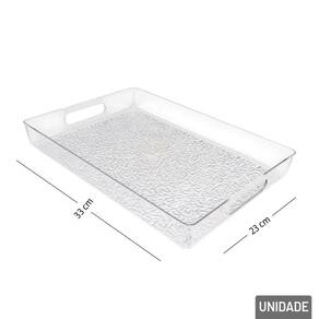 Bandeja Decorativa de Plástico 23x33cm Crist Adicione um toque de sofisticação e praticidade à sua decoração com a elegante Bandeja Decorativa de 23x33cm, em Modelo Cristal com Base em Relevos. Com um design refinado que remete à delicadeza do cristal, essa peça é perfeita para compor ambientes com charme e funcionalidade.\nFabricada em plástico de alta qualidade, ela alia leveza e resistência, sendo ideal para uso decorativo ou utilitário. A base em relevos proporciona um visual diferenciado, com textura elegante que enriquece a composição da peça e evita o deslizamento de objetos.\n-Especificações:\nMarca : FWB\nTipo de material : Plástico\nCores ou Estampa : Transparente\nDimensões do Produto : 4,5 X 23 X 33 CM\nDimensões da Embalagem : 4,5 X 23 X 33 CM\nPeso Bruto (Gramas) : 0.392 Marca: Não Informado
