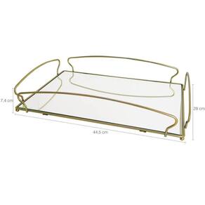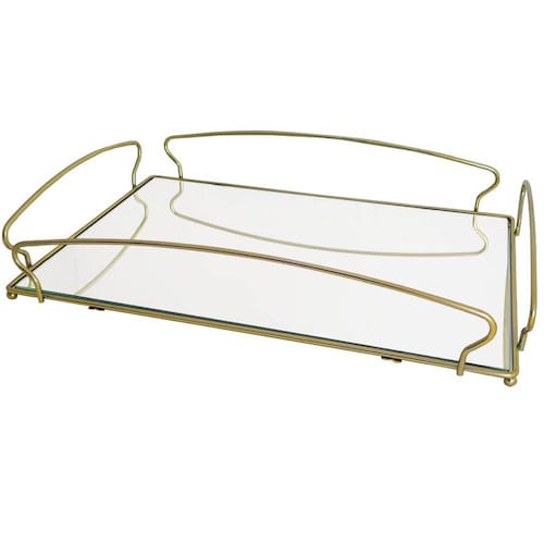 Garantia: 3 meses / Peso: 1,454Kg / Cor: Dourada / Ref: 31539 Dimensões: 44,5cm (C) x 26,5cm (L) x 7,5cm (A) Dimensões área de uso: 43cm (C) x 28cm (L) Altura da base: 1,5cm; Espessura do aço: 4mm; Espessura do espelho: 5mm; Formato: Retangular com cantos arredondados; Observação: Itens decorativos em cima da bandeja não acompanham o produto. Cuidados e limpeza: - Limpar com pano levemente umedecido com água, seguido de pano seco; - Não utilizar produtos químicos ou abrasivos na limpeza; - Evitar batidas e o contato com objetos cortantes; - Manter o produto em local seco e arejado; - Não vai à lava-louças; - Produto indicado para decoração; - Manter sempre sobre uma superfície plana; - Peso máximo suportado: 1kg.