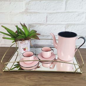 Bandeja decorativa para deixar o espaço interno ainda mais lindo, decore o cantinho, estante ou até mesmo o espaço de trabalho com a bandeja. Uma bandeja decorativa com o modelo totalmente diferente, de formato retangular e cor dourada, deixando o espaço ainda mais sofisticado. Possui 43cm de comprimento e 28cm de largura, você pode decorar com objetos, o fundo da bandeja é espelhado. Aproveite e decore com objetos clín.