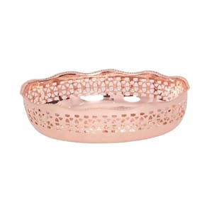 A bandeja decorativa oval em metal cobre rose gold é uma peça charmosa e sofisticada que traz um toque de elegância ao ambiente. Seu design delicado com bordas trabalhadas e acabamento brilhante valoriza a decoração e adiciona requinte à composição.