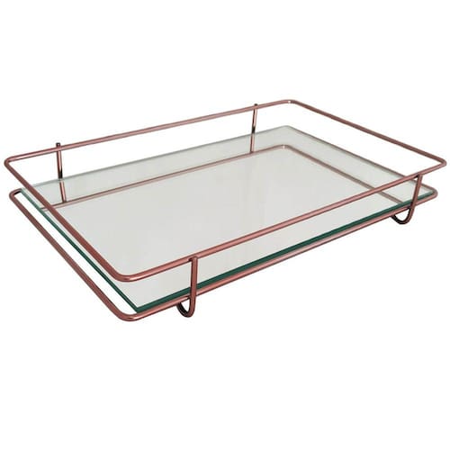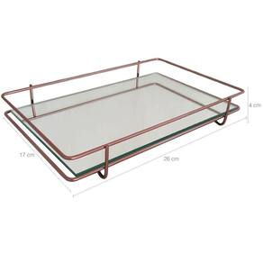 Garantia: 90 Dias / Peso: 558g / Cor: rose gold / Ref: 31467 Dimensões: 26cm (C) x 17cm (L) x 4cm (A); Dimensões da área de uso: 25cm (C) x 15,5cm (L); Altura da base: 1,5cm; Espessura do aço: 4mm; Espessura do espelho: 5mm; Formato: Retangular com cantos arredondados; Observação: Itens decorativos em cima da bandeja não acompanham o produto.