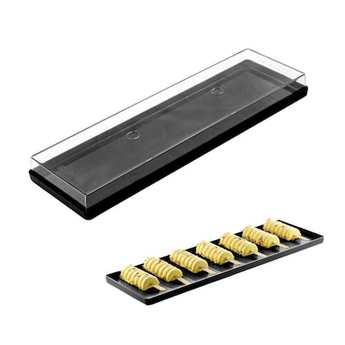 A bandeja de policarbonato com tampa transparente da Silikomart é ideal para armazenar e apresentar seus doces e salgados com elegância em festas, buffets e aniversários.